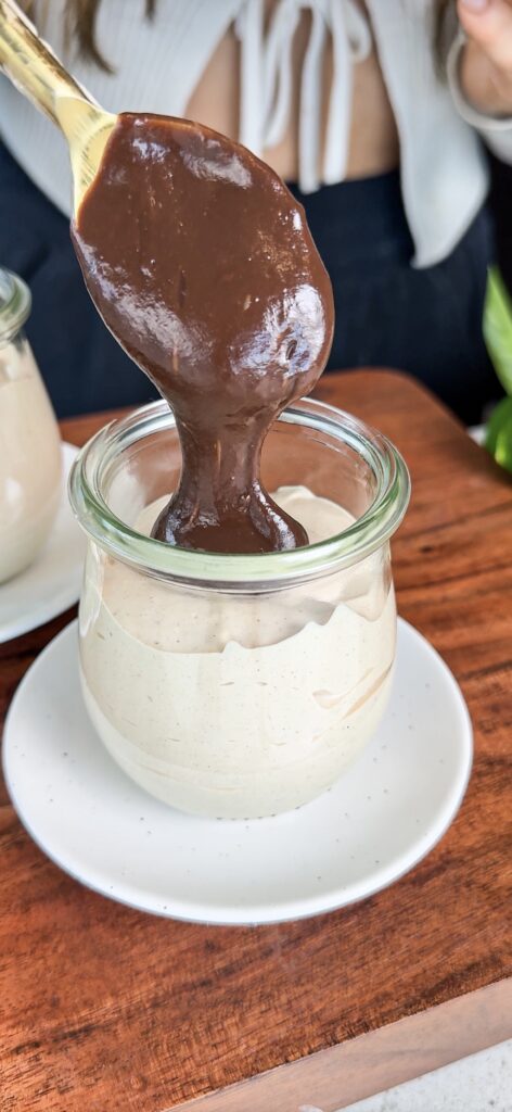 - Taste the mousse & adjust as you’d like – an extra tbsp of peanut butter for more flavor, extra sweetener or vanilla, etc. Add the peanut butter mousse to your jars.